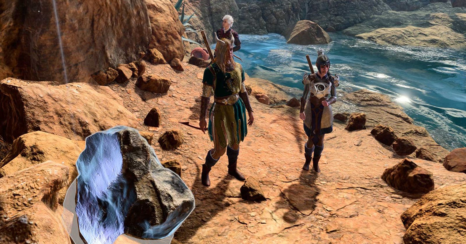 近くのマインド フレイヤー ポッドに向かい、崖から海に向かってカメラを向けると、水を渡って移動した岩に続く道が見えるはずです。 それが削られた岩です。
