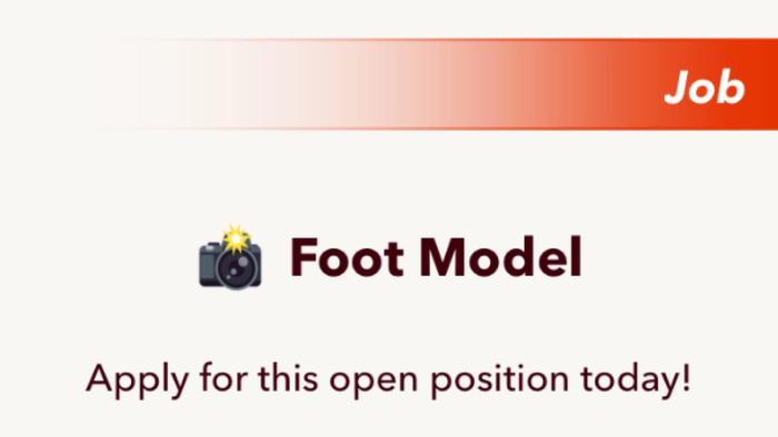 見た目と健康状態が高いため、フットモデルジョブが表示されたらすぐに申し込むことができます。 18歳以上であると仮定します。統計が十分に高い場合は、面接が提供され、ランダムな質問に答えます。 最適と思われるオプションを選択してください。成功すると、BitLifeモデルになります。