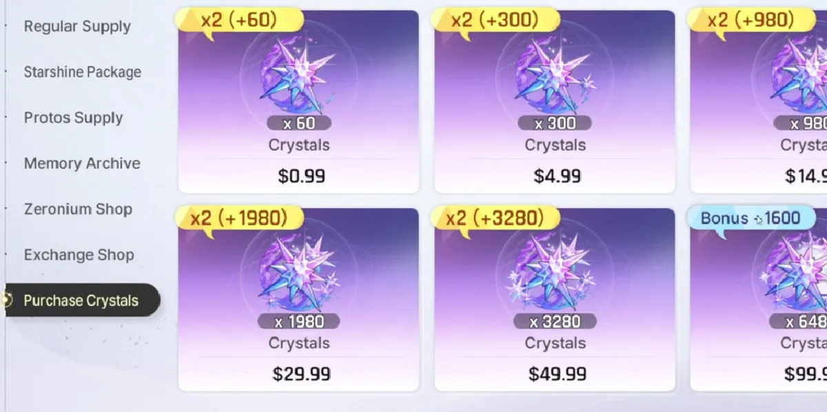 ここで 100 ドルのほとんどを費やすことになります。クリスタルの直接購入にはさまざまな種類があります。これの素晴らしい点の 1 つは、初めてパックを購入すると 2 倍の量のクリスタルを獲得できることです。初めてこれは素晴らしいように思えますが、このボーナスを使用すると、パックの価値が大幅に下がります。このため、毎回同じパックを購入するのではなく、常に異なるパックに支出を分散する必要があります。