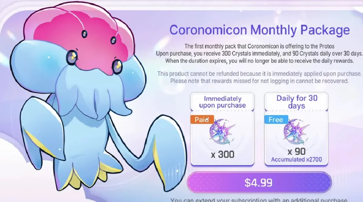 マンスリーカードはショップ全体で最も長期的な価値があります。価格はわずか 4.99 ドルです。金額を支払うとすぐに 300 クリスタルを獲得し、その後 30 日間毎日 90 クリスタルを獲得します。合計3000個のクリスタルを獲得できます。各プルには 160 クリスタルのコストがかかることがわかっています。つまり、この購入で合計約 18 回のプルができることになります。基本的な計算を行うと、1 回のプルに約 0.27 ドルの費用がかかることがわかります。これにより、安定したプレイヤーであれば最も効率的な購入の 1 つになります。
