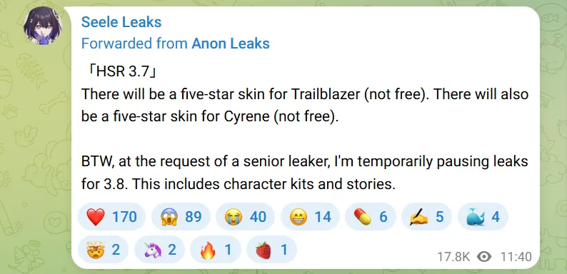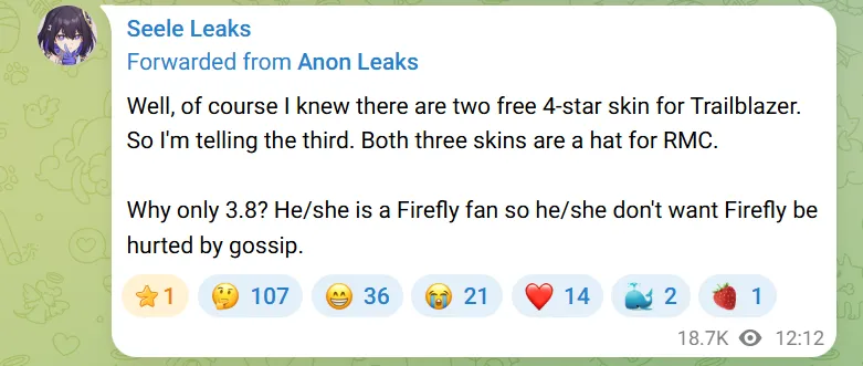 Anon のリークによると、3.7 のバナーには Cyrene と Trailblazer のスキンが含まれる予定です。興奮した新情報とともに、Anon は Firefly をゴシップから守るために HSR 3.8 に関する情報を一時的に漏らさないことも発表しました。