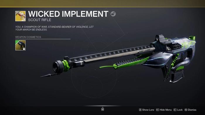 Wicked Implement は 180RPM のステイシス スカウト ライフルです。 この武器の特典は次のとおりです。