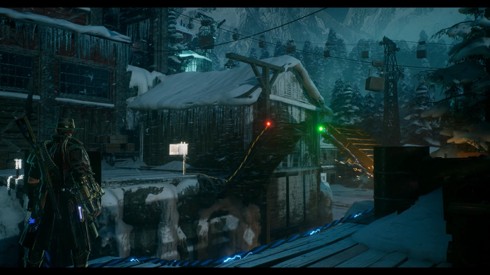 ゲームをプレイしていた短い時間で、私は Evil West の真ん中に直接配置され、いくつかのミッションが行われました。チュートリアルも、何をしているのかの手がかりもなく、雪に覆われた層を通り過ぎて、鉱業と工業化された町へと前進しなければなりませんでした。 . 審美的に、この背景は素晴らしいです。 それは、洗練された機械がその周りの冷たい死の世界に対して輝くことを可能にします. Evil West は明らかに、それがどのように見えるかを非常に気にかけています。