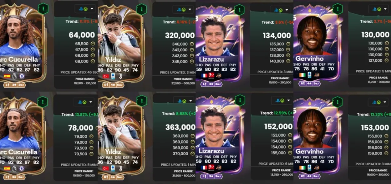 私たちのリストの 2 番目の方法は、カード フリップ法です。これは、EA FC 26 で FUT コインを作成する最も古く、最も信頼できる方法の 1 つでもあります。この方法は株式市場の方法と呼ぶことができます。ここでのコンセプトはシンプルです。特定のカードの価格変動を追跡し、それらを安く購入し、価値が上昇したときに販売する必要があります。カードのめくり方には次の 3 つがあります。