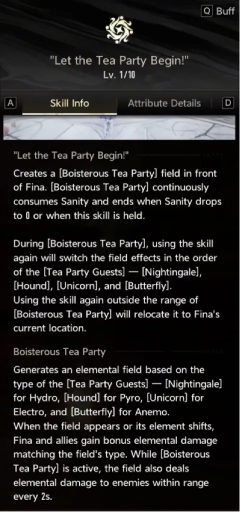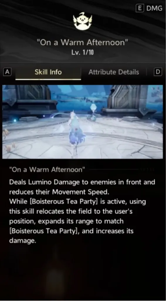 ·シナジー:彼女のアルティメットがアクティブな間、このスキルを使用すると、ティーパーティーフィールドが彼女の位置に再配置され、範囲が拡大し、このスキルのダメージが増加します。