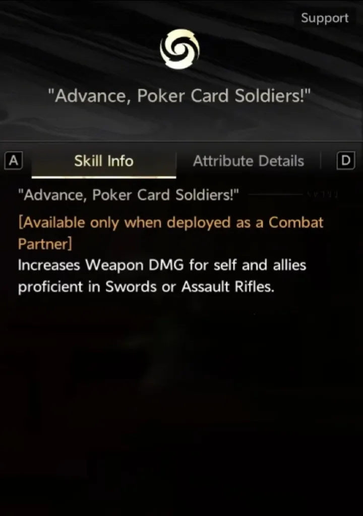 ·進め、ポーカー カードの兵士たち!: (戦闘パートナーとして配備されている場合にのみ利用可能)。剣またはアサルトライフルに習熟した自分と味方の武器ダメージが増加します。