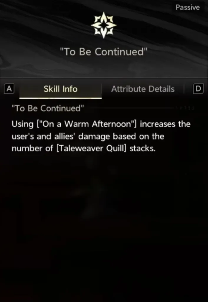 ·To Be Continued: 彼女の DMG スキルを使用すると、現在のテイルウィーバーの羽ペンのスタックに基づいてチームのダメージがさらに増加します。