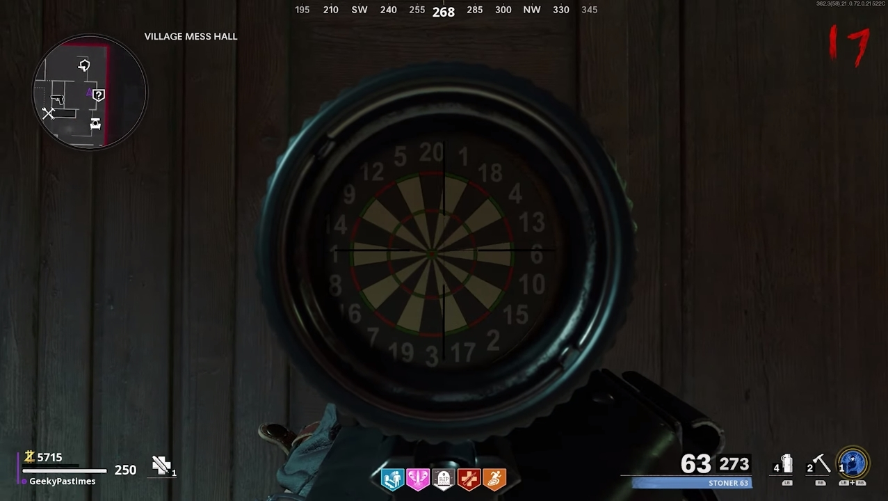 ダーツボードは、Wunderfizzマシンの隣、アトリウムを通って、Village MessHallのPack-A-Punchマシンの左側にあります。