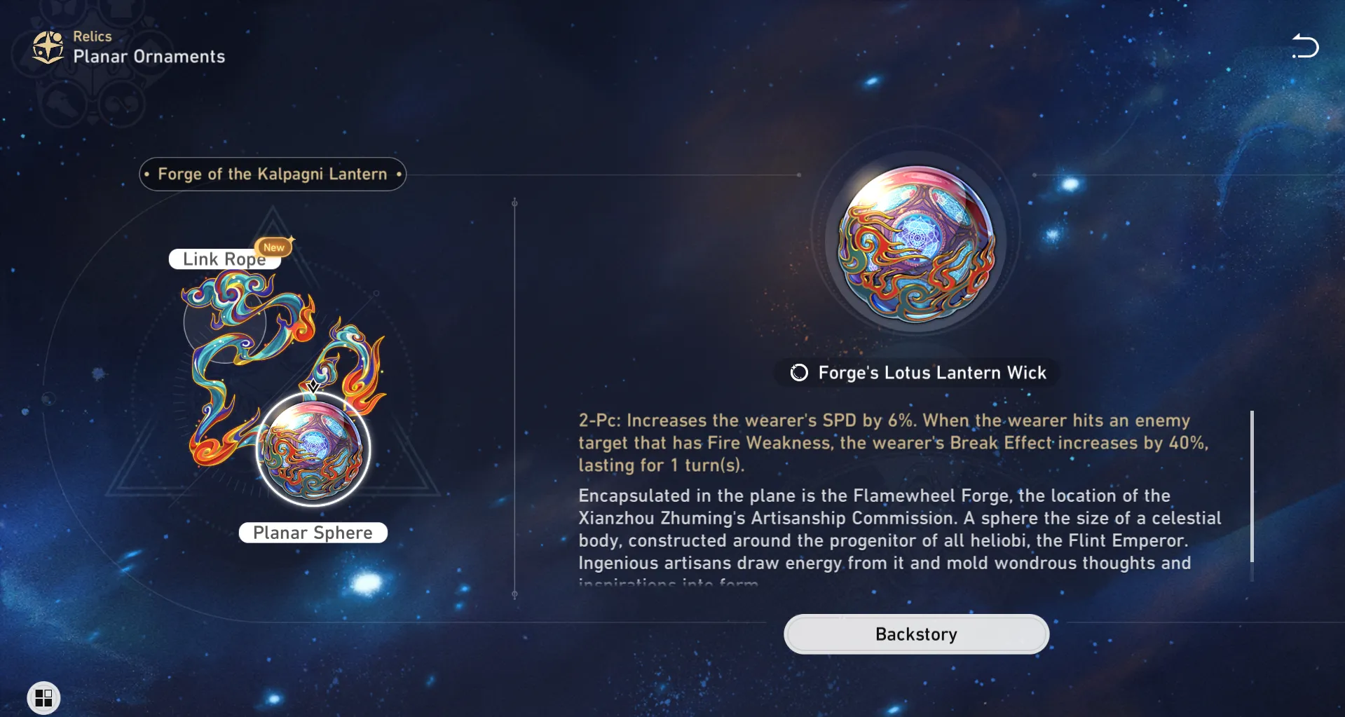 オーナメントの場合、ファイアフライの BiS オーナメント セットは彼女の代表的なフォージのロータス ランタン ウィックで、これにより彼女の追加の Spd ステータスが付与され、火の弱点を持つ敵に対するブレイク効果ダメージが増加します。