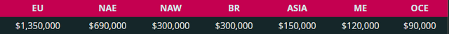 2021年には4つのFNCSシーズンがあり、それぞれに$ 3,000,000の賞金プールがあり、年間のFNCS賞金は合計$ 12,000,000になる予定です。 $ 3,000,000の賞金プールのすべての地域での分配は、現在、最新の競争参加と地域のゲーム人口に基づいています。 以下のチャートを提供しており、必要な調整を行うために、各シーズンの前にデータを監視および評価し続けます。