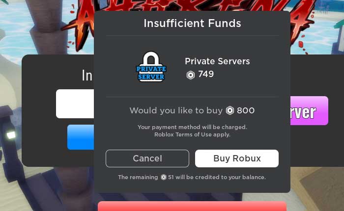 - アカウントに 750 を超える Robux がある場合は、プライベート サーバーを購入するオプションが表示されます。