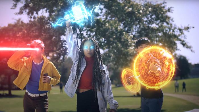 ティーザートレーラーが示したのは、公園にいるたくさんの子供たちが、上にポータルが開いたときに空を見上げていることでした. その後、彼らはスマートフォンをスワイプして、サイクロプス、ドクター ストレンジ、トールなどのスーパーヒーローの力を発揮しました。 彼らはあらゆる方向に爆破攻撃を開始し、カメラがパンアウトして、公園全体で同じことをしているより多くの人々を示します. カオスです。