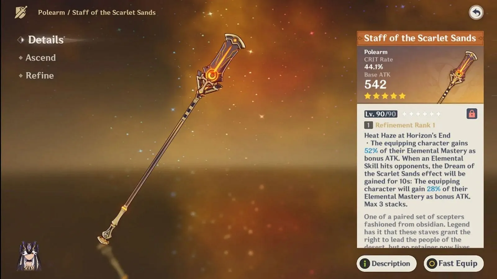 スカーレットサンドのスタッフは以下の分野で非常にうまく機能します。 EM 中心、反応ベース 構築します。 Ineffa は ATK と Elemental Mastery の両方から恩恵を受けます。ATK はシールドと直接ダメージを強化し、EM は月の充電反応を促進します。この武器は、EM をボーナス ATK に変換することで両方のステータスを橋渡しし、パッシブとチーム全体の反応ダメージを直接強化します。