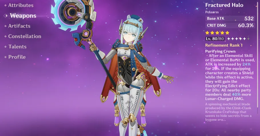 フラクチャード・ハロー (5つ星) +608 ATK / +66.2% CRIT DMG ピュリファイングクラウン エレメンタルスキルまたはエレメンタルバースト使用後、20秒間ATKが24% / 30% / 36% / 42% / 48%増加します。この効果が有効な間に装備しているキャラクターがシールドを作成した場合、彼らは 20 秒間電撃の布告効果を獲得します。近くのパーティーメンバー全員が 40% / 50% / 60% / 70% / 80% 多くの月チャージダメージを与えます。 |