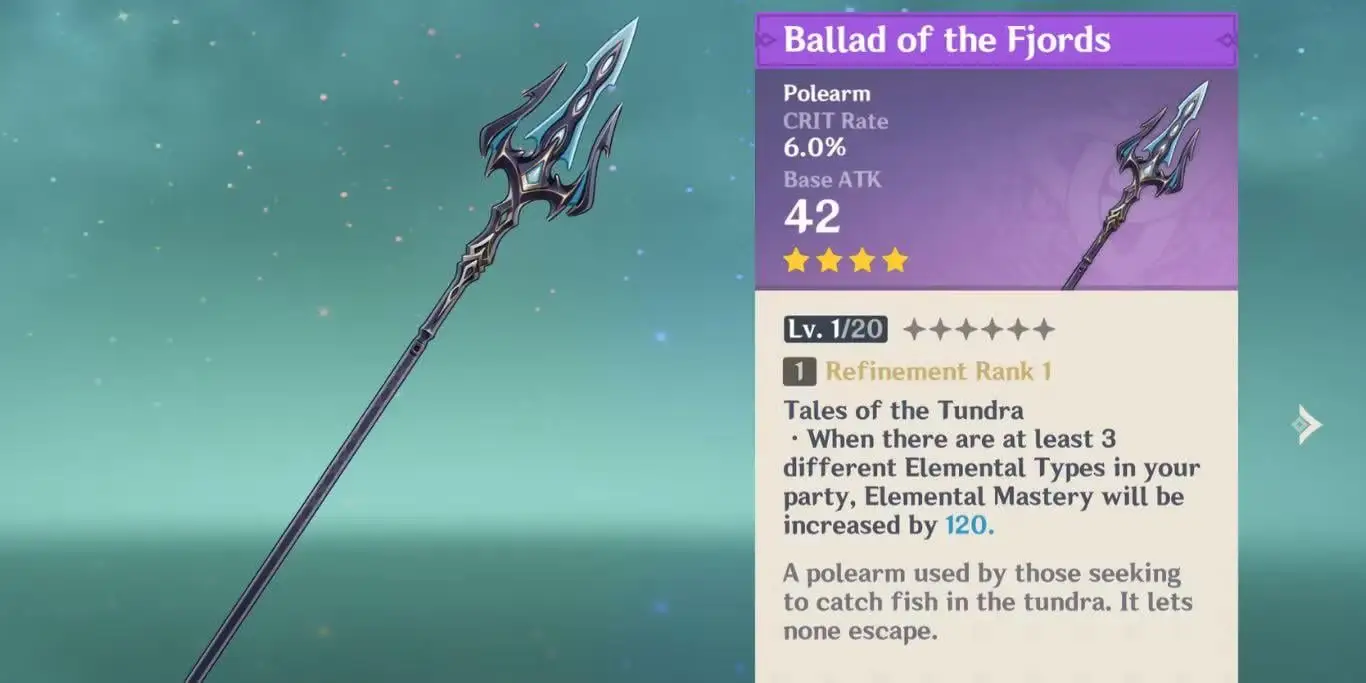 フィヨルドのバラード これは主に、そのパッシブが彼女の理想的な複数要素の反応チームと自然に一致するため、Ineffa に機能します。彼女は、ルナーチャージのスケーリングとチームバフの役割により、エレメンタルマスタリーの恩恵を受けています。 EMブースト 決して無駄ではありません。この武器は彼女の生のエレクトロ DMG 効果や ATK スケーリング効果を直接強化するものではありませんが、間接的に彼女の反応ベースのプレイスタイルをサポートします。これは、ハイドロおよびアネモユニットを備えたエレクトロチャージセットアップで彼女を実行する中程度の支出者にとって特に便利です。スロットで最高のスロットではありませんが、彼女のチームの原型に十分に適合しており、堅実です。 相乗効果ベース 選択。