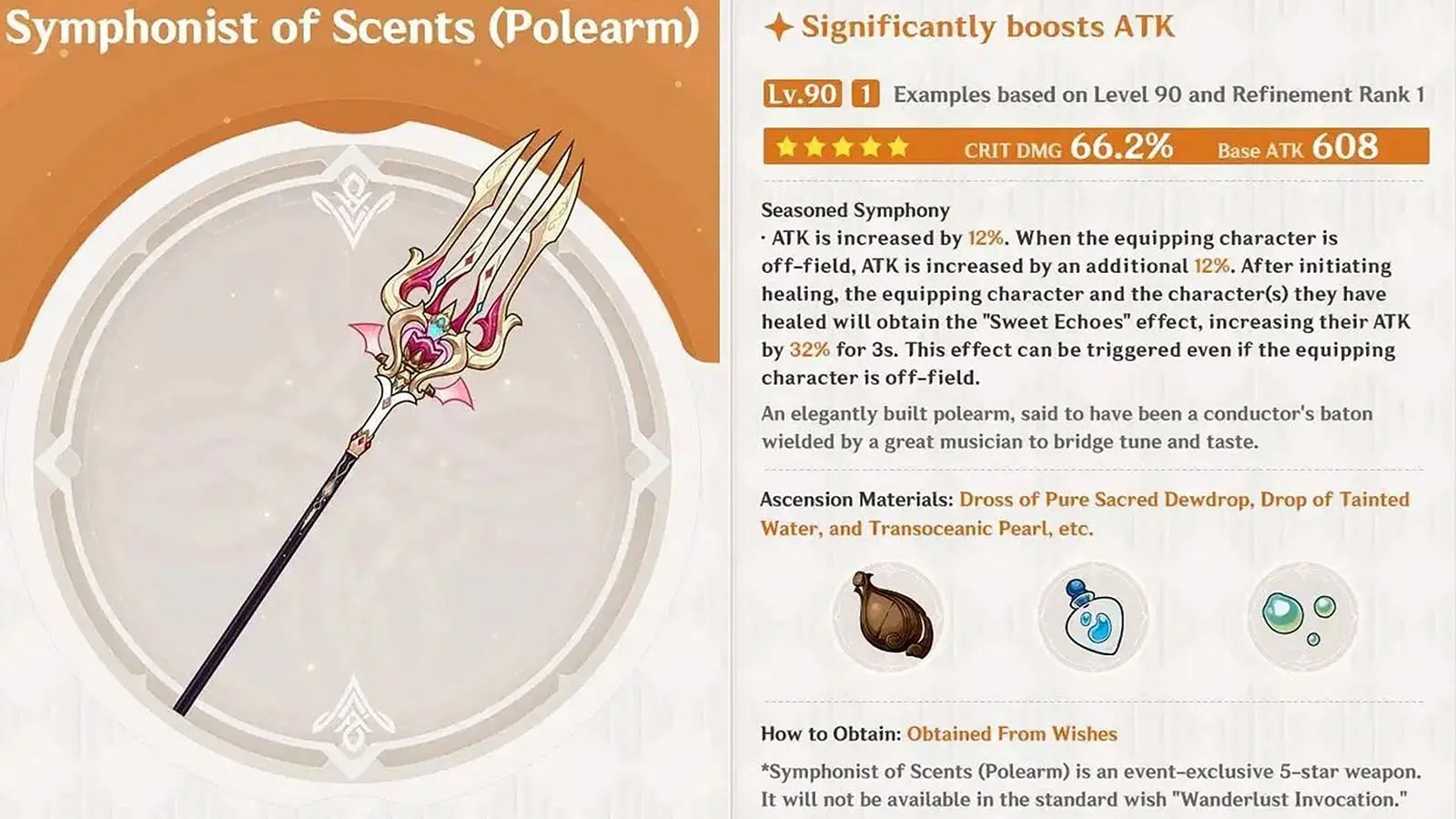 香りのシンフォニー奏者 (5つ星) +608 ATK / +66.15% CRIT DMG 味のあるシンフォニー ATKが12% / 15% / 18% / 21% / 24%増加します。装備キャラが場外にいる場合、ATKがさらに12% / 15% / 18% / 21% / 24%増加する。回復を開始した後、装備しているキャラクターと回復したキャラクターは「スイートエコーズ」効果を獲得し、3秒間攻撃力が32% / 40% / 48% / 56% / 64%増加します。この効果は装備キャラが場外にいても発動する。 |