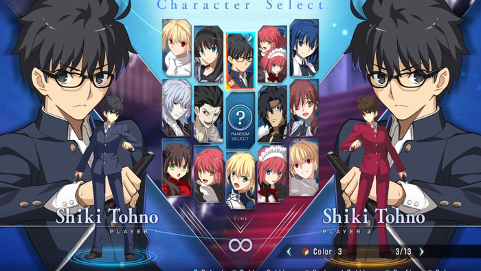 Melty Blood Type Luminaでは、このゲームのベースとなっているビジュアルノベルである月姫(青いガラスの月のかけら)に似た、遠野志樹が主人公です。 アニメ番組では普通の高校生のように見えるが、遠野志希は「死の神秘の目」と呼ばれる力を持っている。 これにより、四季は世界中のすべての線を見ることができ、これらの線を刃でなぞるとすぐに破壊または殺されます。