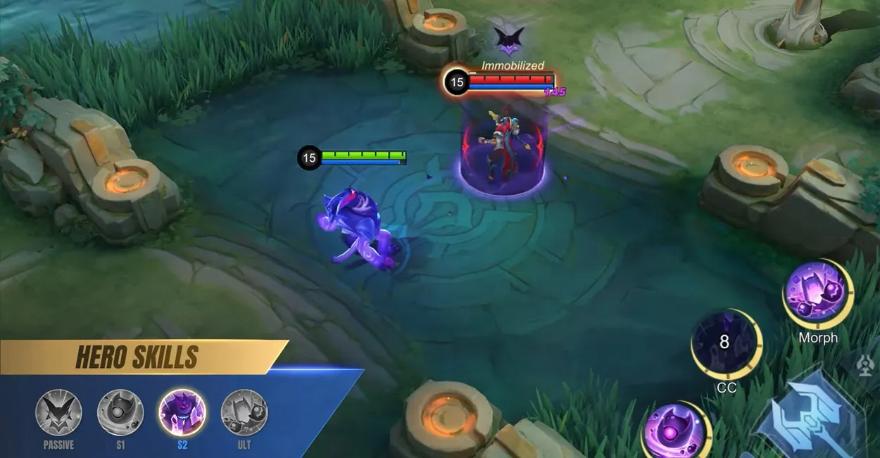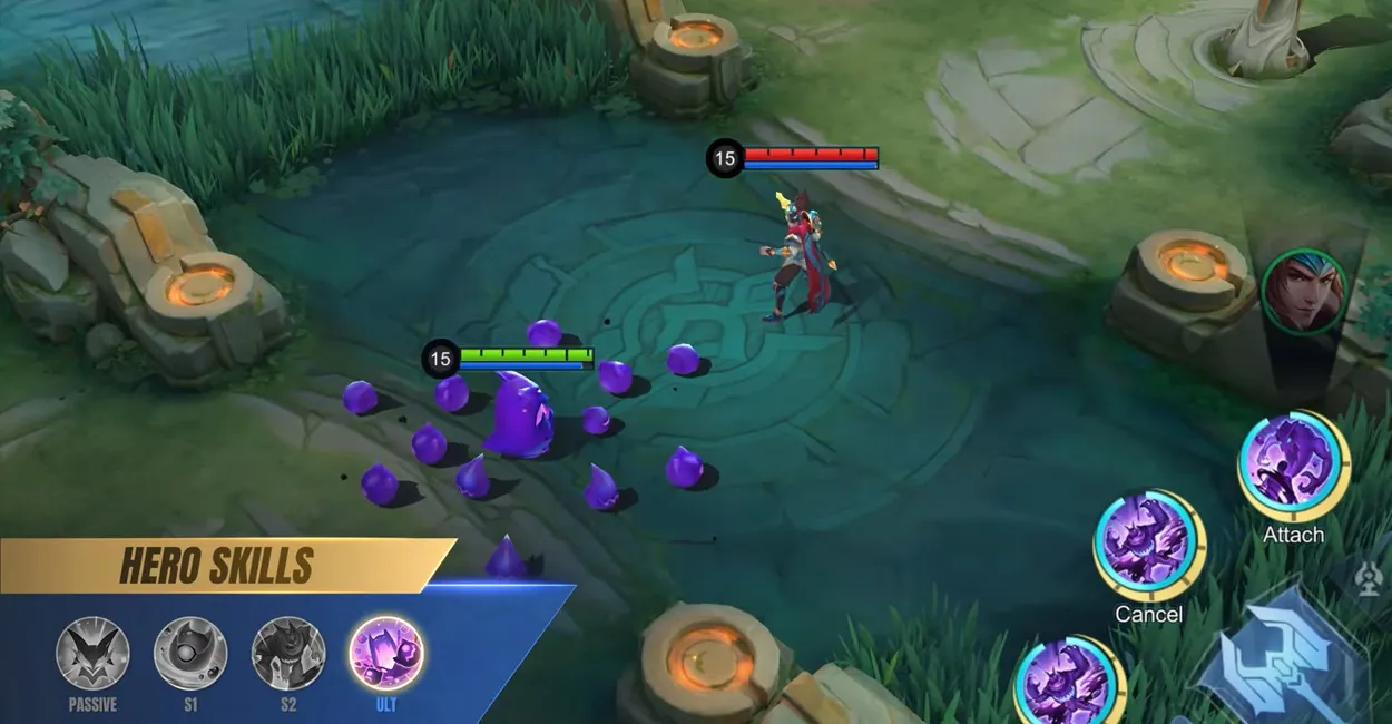 グルーの 3 番目のスキルまたはそのアルティメットは、治癒効果を持つアタッチ タイプのスキルです。 The Ultimate needs to be charged and cannot be used directly.敵ヒーローがスティッキー (パッシブ) のスタックがフルに達すると、グルーは 9 秒間ターゲットに付着します。アルティメットを使用すると、Gloo の MAX HP の 25 ~ 30% が瞬時に回復します。
