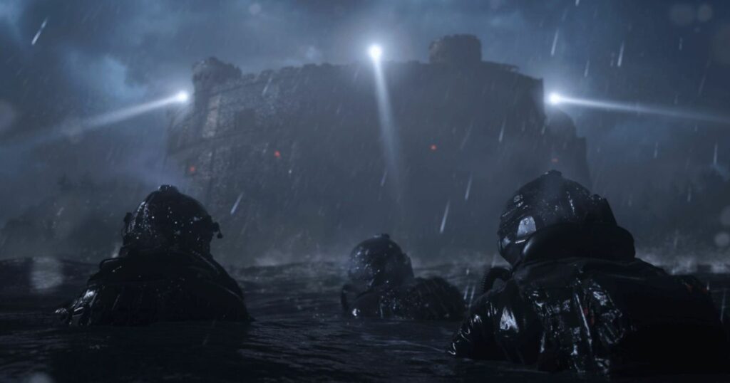 上の写真は、ゲーム内でのこのエクスペリエンスがどのように見えるかを示しています。 さらに、公式予告編ビデオの冒頭を注意深く見ると、水中の離島の城に特殊工作員のグループが忍び寄っているのがわかります。 このクリップは次のようになります。