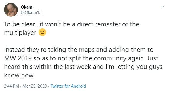 CODリーカー 岡見 ただし、MW2リマスターマルチプレイヤーは直接リマスターではなく、マップがモダンウォーフェアに追加されることを発表して、何百万人もの人々の心を打ち砕きました。