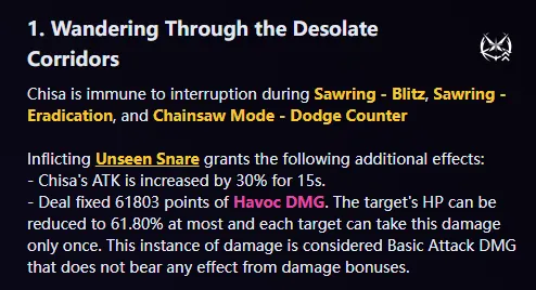 効果: 「チートデス」メカニズムを提供し、Unseen Snareをアップグレードし、マークされたターゲットが30%以上のマイナスステータスダメージを受け、チサ自身から40%以上のダメージを受けるようにします。
