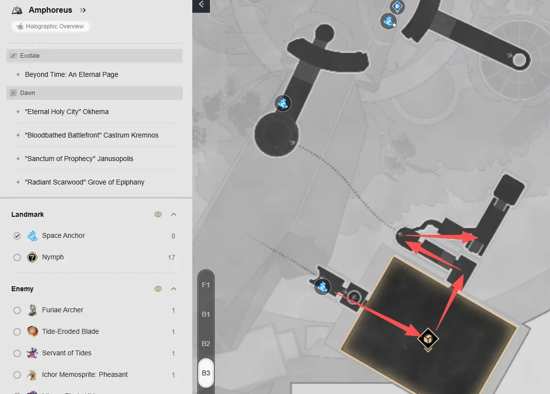 B3 の Myth Space Anchor の亀裂にテレポートすると、パズルが近くにあります。次に、B4 の Worldbearing Statue Space Anchor に行き、近くのエレベーターに乗って上に行きます。