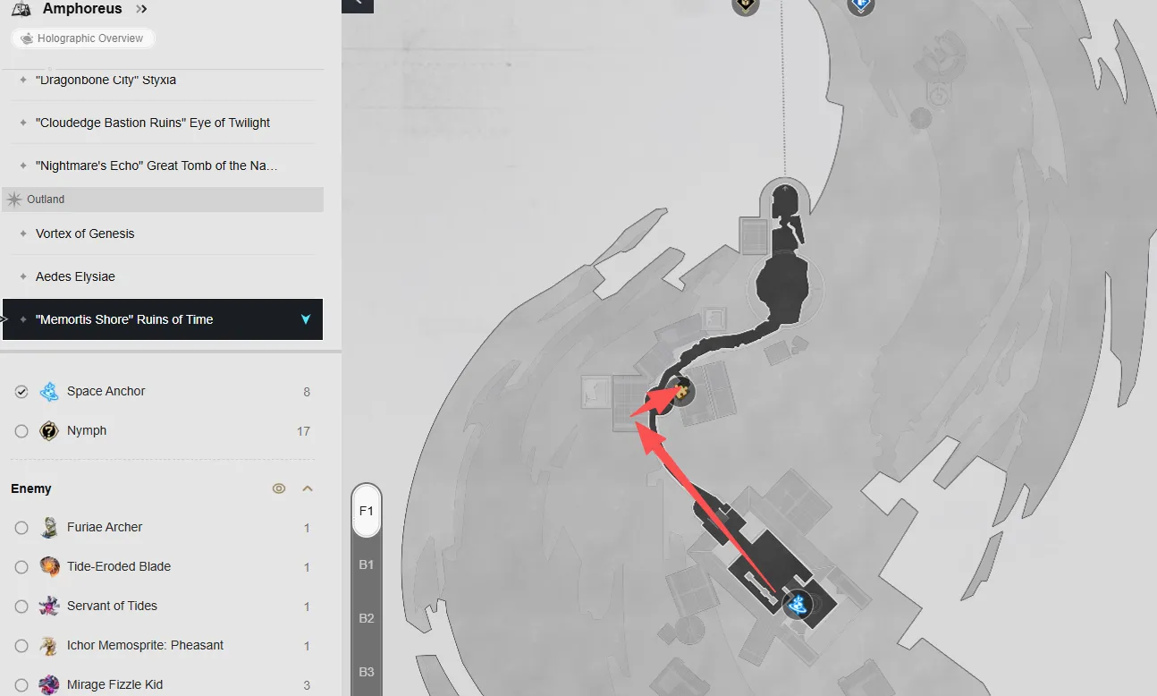 F1 の遺跡の中庭スペース アンカーにテレポートし、右側の道に到達するまで前進します。