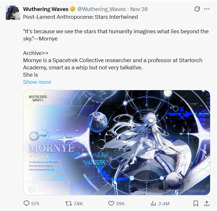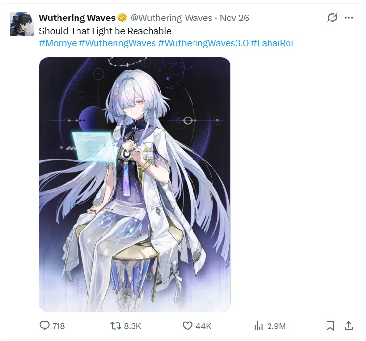 モーニエの特徴は、 非常にユニークで抽象的なデザイン と 「銀河っぽい」 外観。彼女の全体的な外観は珍しくて興味深いため、デザインだけから彼女の能力や戦闘での役割を予測するのは困難です。デザインは、これまでの Weathering Waves のキャラクターとは異なり、新鮮で際立っていて、謎と独創性を強調しています。